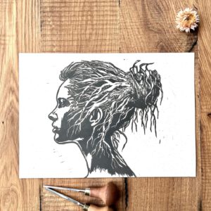 Dies ist ein handgedruckter Linolschnitt (Reduktionsdruck) auf DIN A5 großem Graspapier (300g/qm). Jeder Druck ist ein handgefertigtes Original und somit ein Unikat. In der Textur des Druckes kann es zu leichten Abweichungen bei den Farben und der Druckintensität kommen.