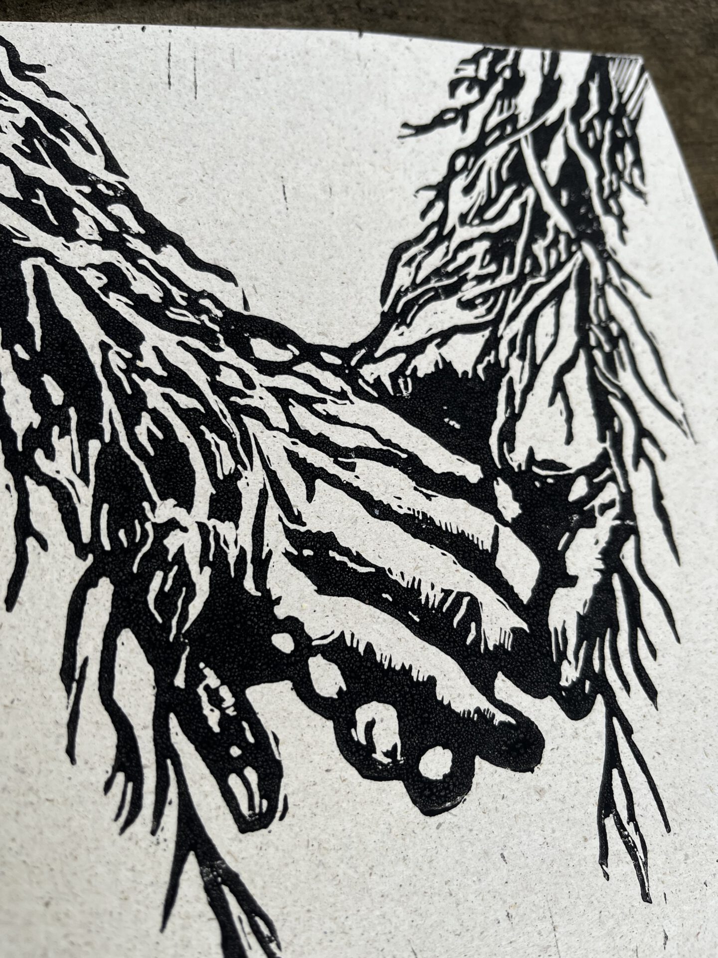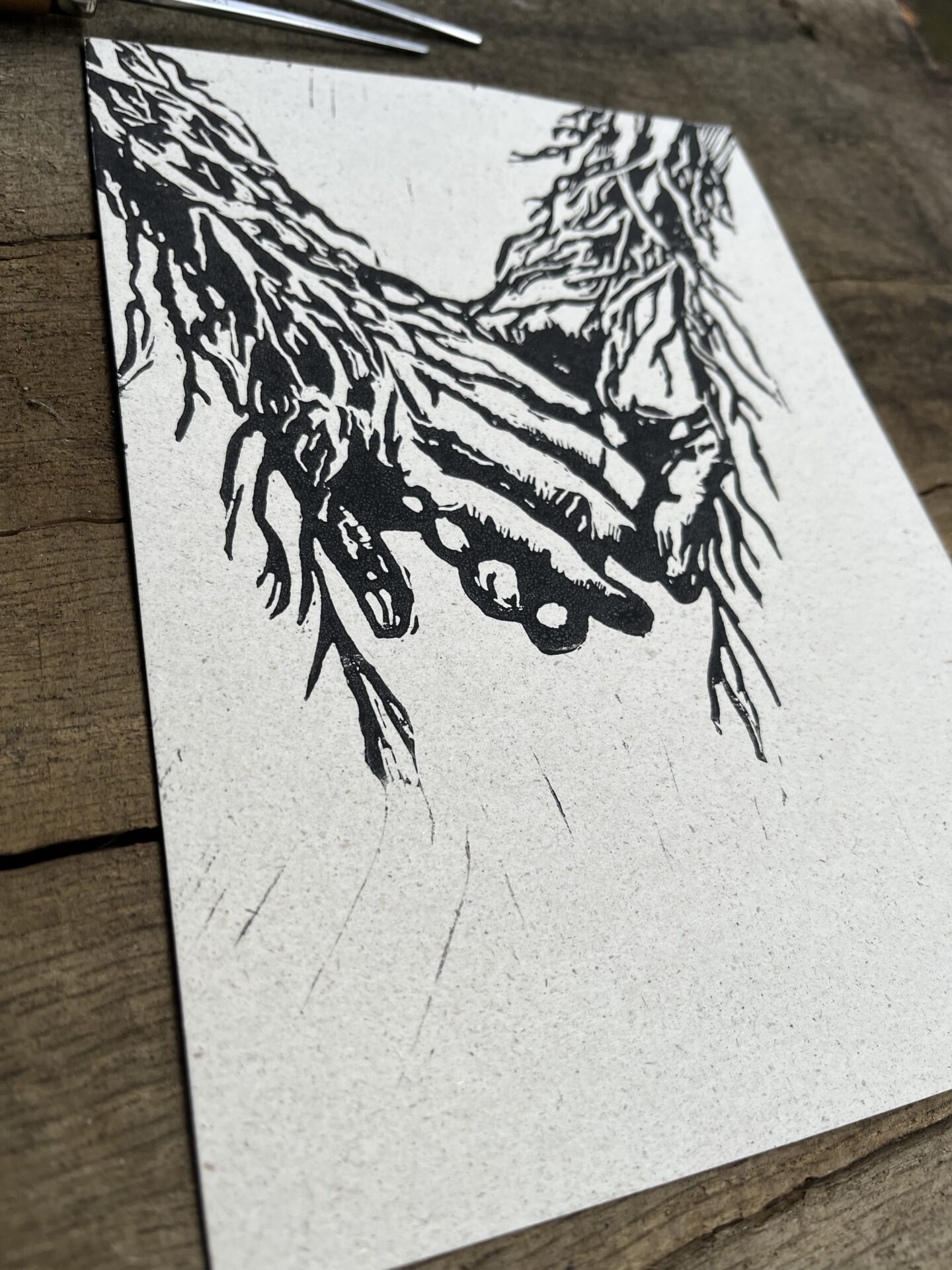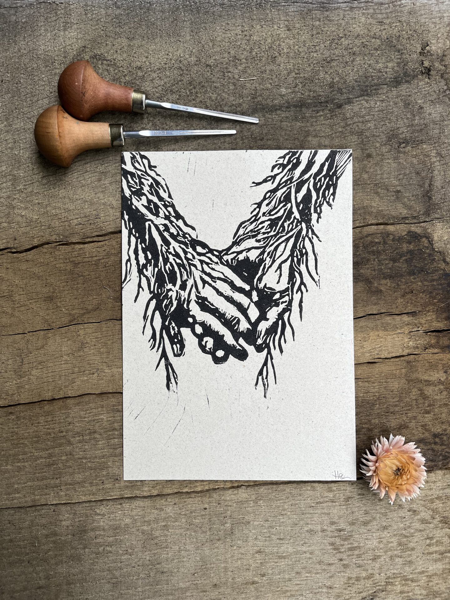 Dies ist ein handgedruckter Linolschnitt auf DIN A5 großem Graspapier (300g/qm). Jeder Druck ist ein handgefertigtes Original und somit ein Unikat. In der Textur des Druckes kann es zu leichten Abweichungen bei den Farben und der Druckintensität kommen.